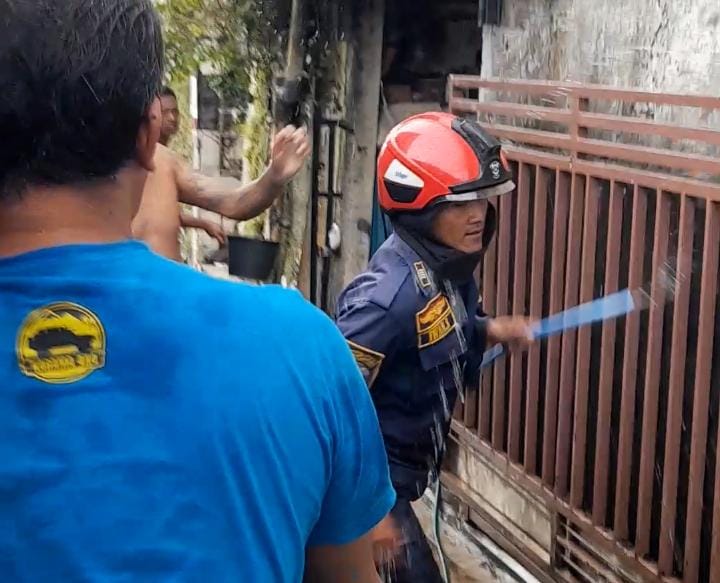 Sementara itu seorang petugas Damkar yang datang langsung mengambil selang tersebut dan membantu Iwan mencegah api agar tidak merembet.