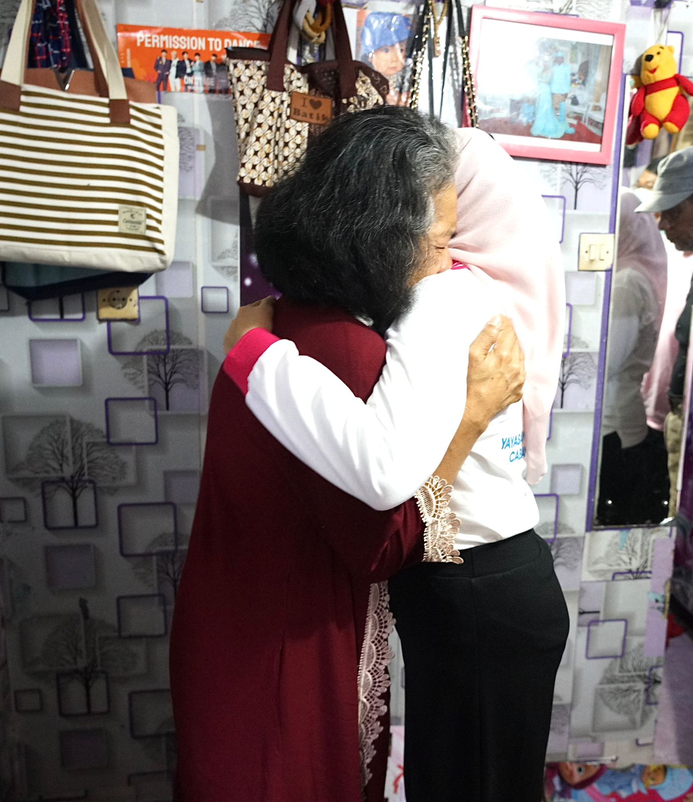 Dalam pelukan Yantie Rachim, Asmah menumpahkan perasaannya meski tanpa suara, akibat kondisi tenggorokannya.